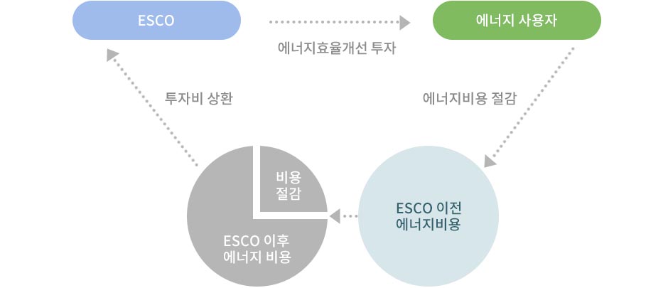 3에너지 사용자(공공기관, 산업체 등)는 투자 사업비 부담 없이 노후시설을 에너지절약형 시설로 교체할 수 있으며, 그로 인한 에너지비용 절감액으로 사업비를 지급하고, 사업비 지급 후의 절감액은 사용자의 이익으로 남게 됩니다.